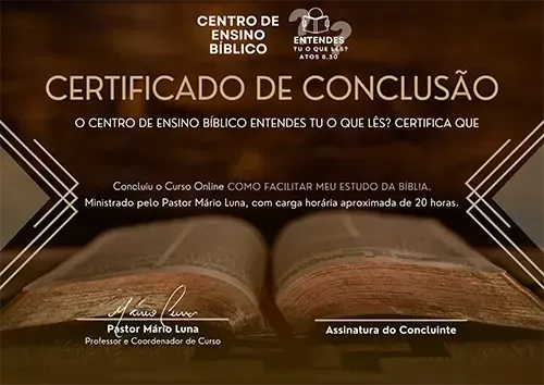 Após concluir o Curso de COMO FACILITAR MEU ESTUDO DA BÍBLIA você irá baixar um maravilhoso certificado com 20 Horas, direto de sua área restrita, sem custo adicional.